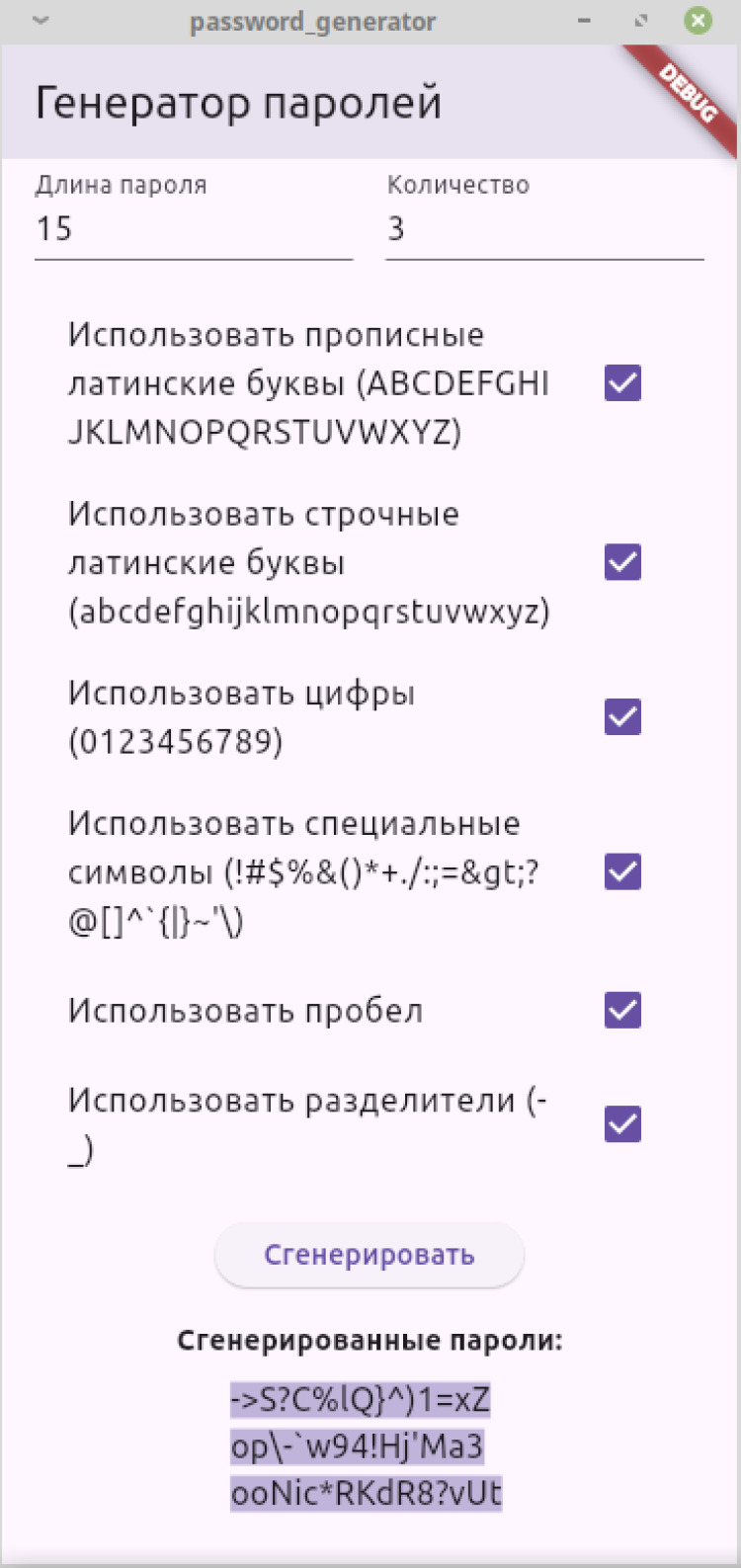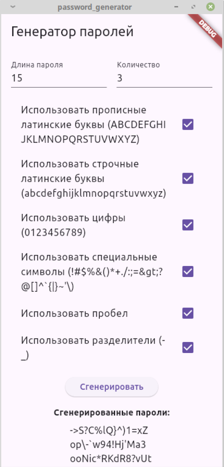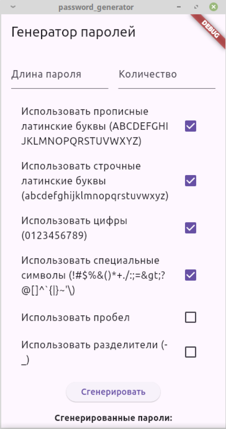 Генератор паролей — приложение для генерации надежных паролей. Доступен выбор количества паролей, их длины и добавления необходимых символов. После завершения процесса генерации, созданные пароли можно выделить и скопировать. Программа распространяется бесплатно.