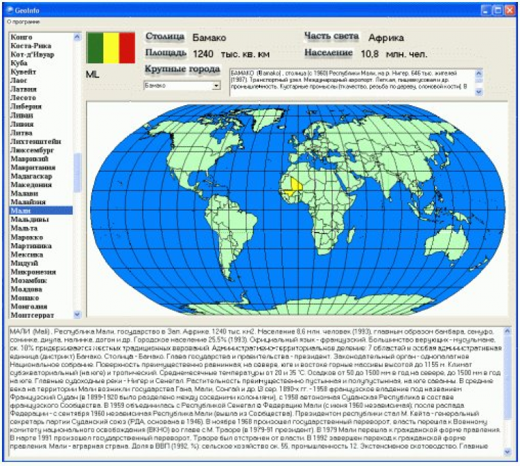 Geo Information System - это данная программа представляет собой справочную базу по всем известным странам мира. Содержит общую информацию о странах (площадь, численность населения, международное сокращение). Показывает столицу, флаг, материк. Расположение интересующей страны отмечается на карте. Предлагается подробное описание каждой страны, а также общая информация о крупных городах стран.