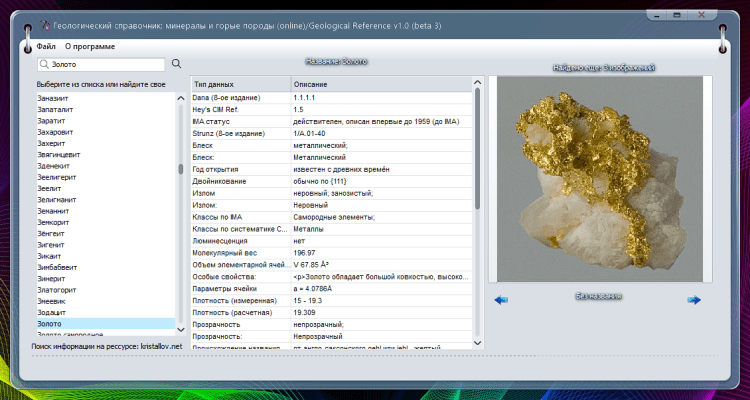 Geological Reference - это программа-справочник для вывода информации о минералах и горных породах. С ее помощью любой желающий может разыскать интересующую его информацию о минералах, драгоценных камнях, породах и т.п. В частности, она направлена на помощь студентам в поиске необходимых данных по нужному минералу или горной породе в виде таблицы с иллюстрациями.