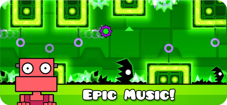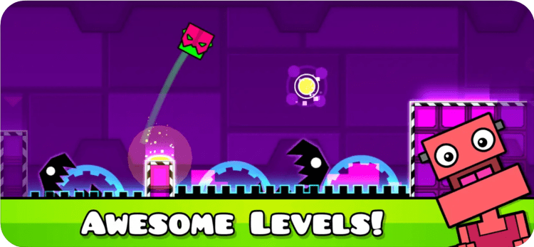 В Geometry Dash Meltdown вам потребуется вся ваша скорость реакции, чувство ритма и ловкость пальцев. Вовремя нажимайте на экран своего мобильного устройства, чтобы увернуться от преграды. В этом вам поможет прекрасная фоновая музыка F-777.