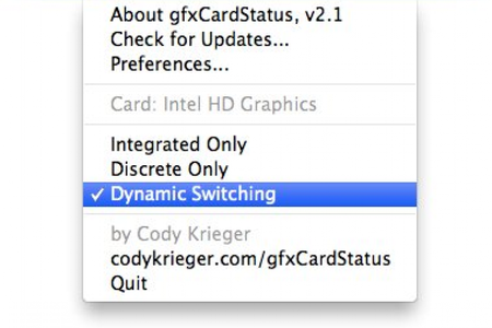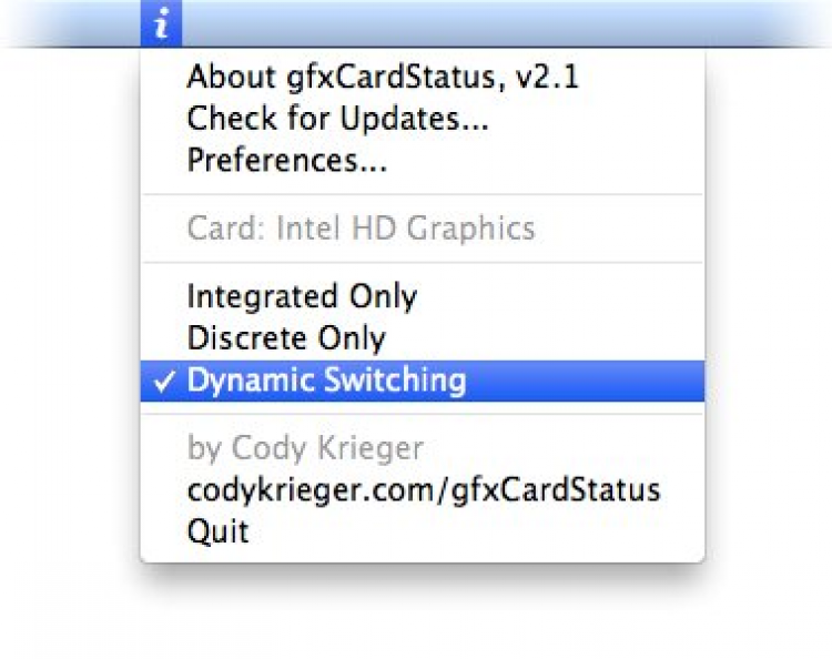 gfxCardStatus Небольшое приложение, которое сидит в строке меню и следит за тем, какая из двух видео-карт MacBook Pro используется в данный момент. На значке gfxCardStatus в строке меню буквами i и d обозанчается какая карта используется - встроенная или дискретная. При смене карты программа предупредит пользователя об этом. При этом можно выбирать карту вручную, в зависимости от потребностей.