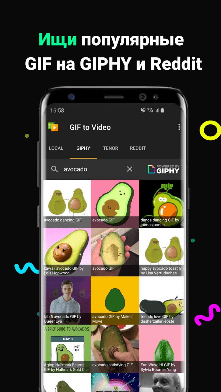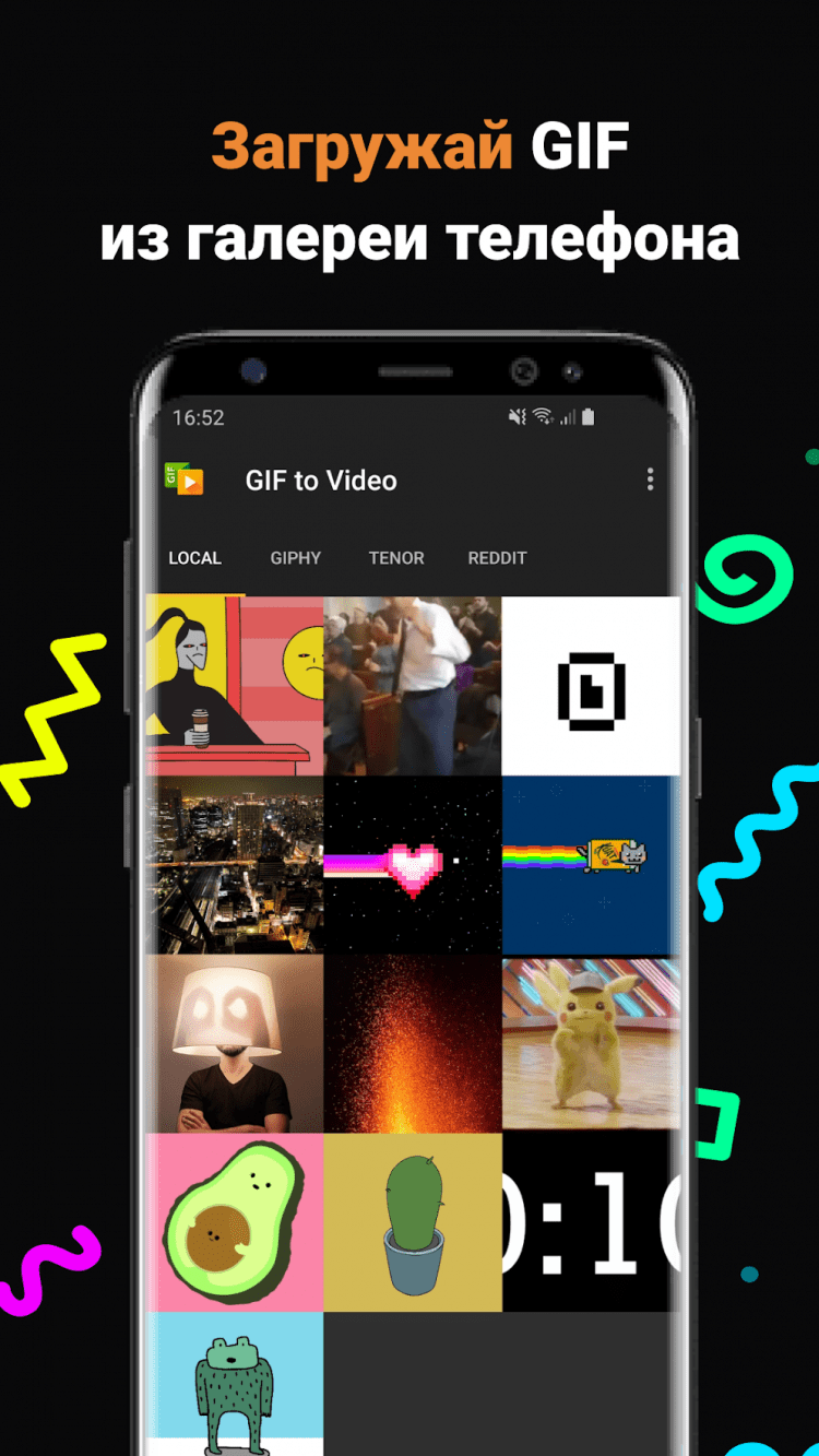 Как становится понятно из названия, это приложение предназначено для конвертирования GIF-анимаций в видео форматы. Не удобно открывать гифки на мобильном телефоне? Не беда. Трансформируйте их в видео и просматривайте их в привычных проигрывателях. Такие файлы проще отправлять через Instagram, WhatsApp и другие соцсети или мессенджеры. А главное - последняя версия приложения способна работать не только с GIF из памяти смартфона. Вы можете загружать нужные анимации с GIPHY, Tenor или Reddit, прямо через это приложение.