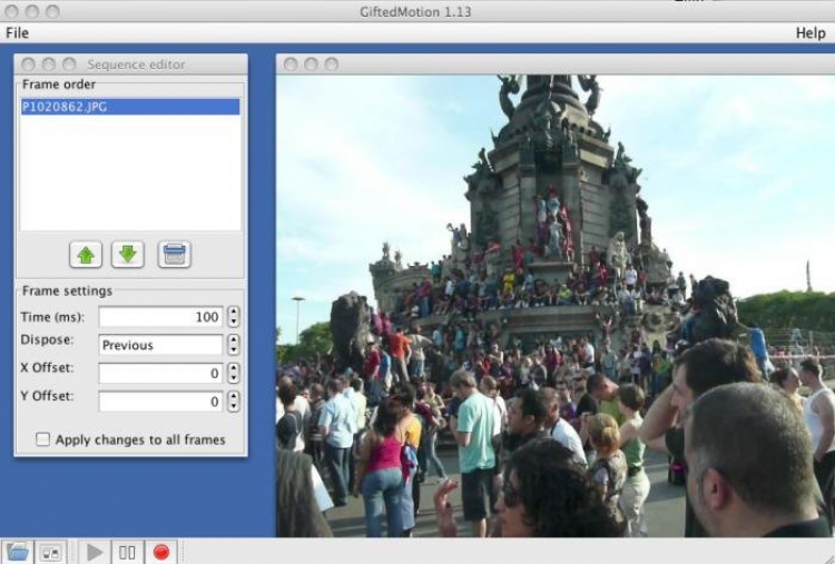 GiftedMotion Небольшая программка для создания GIF-анимации. Программа GiftedMotion очень проста в использовании. Вам нужно лишь выбрать картинки и расположить их нужном порядке. А затем нажать "Play" и "Record". В настройках можно задать интервал между кадрами и смещение по вертикали и горизонтали.