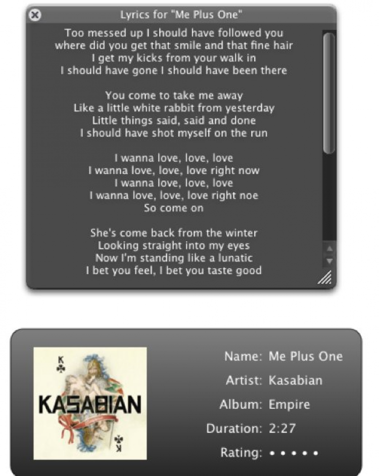 GimmeSomeTune Отображает на рабочем столе два плаващих окошка, одно с информацией о проигрываемой песне, второе с текстом этой песни. GimmeSomeTune показывает название трека и альбома, имя исполнителя, рейтинг и обложку альбома. Обложки, как и тексты песен, GimmeSomeTune умеет искать самостоятельно, в сети. Помимо этого, с ее помощью можно управлять iTunes, исользуя, горячие клавиши.