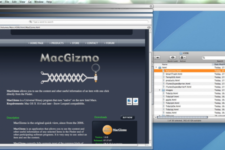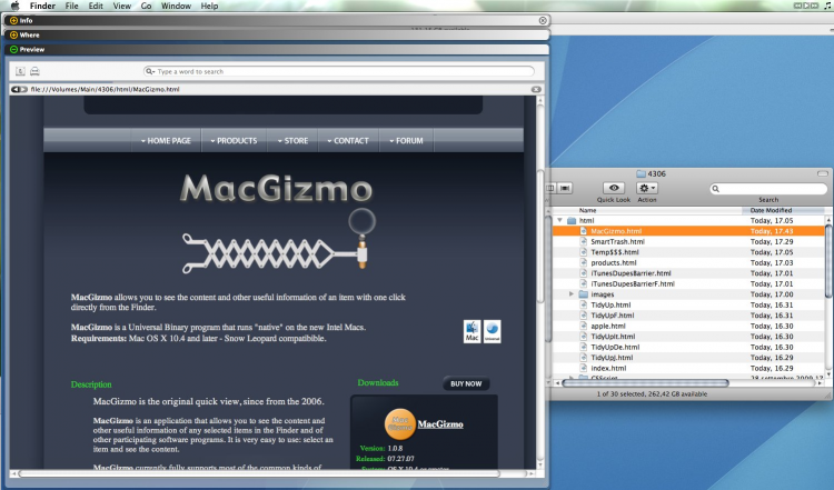 MacGizmo Эта утилита позволяет быстро получить подробную информацию о выбранном в Finder`е файле и просмотреть его содержимое. Программа предельно проста в использовании и поддерживает многие типы файлов, включая изображения, видео, аудио, документы, шрифты и пр.