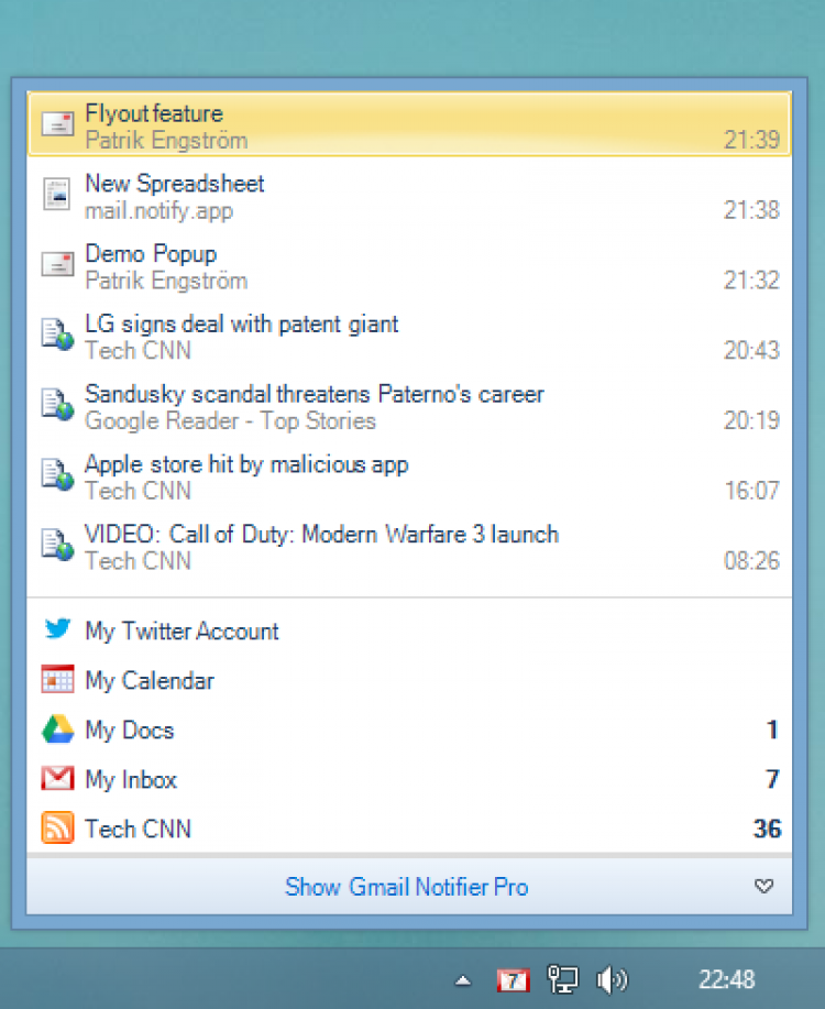 Gmail Notifier Pro можно также использовать для работы с таким сервисами, как Google Calendar, Google Reader, Google News, Google Drive, Google+, Facebook и Twitter.