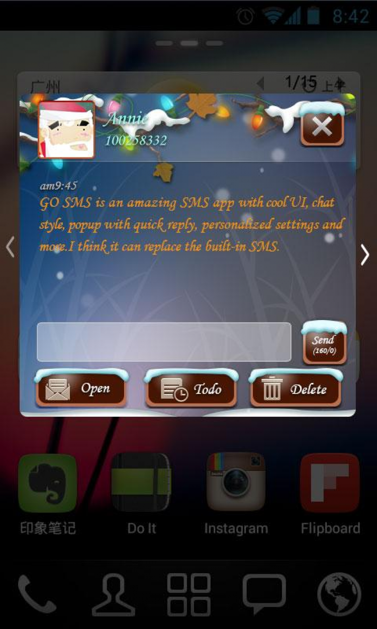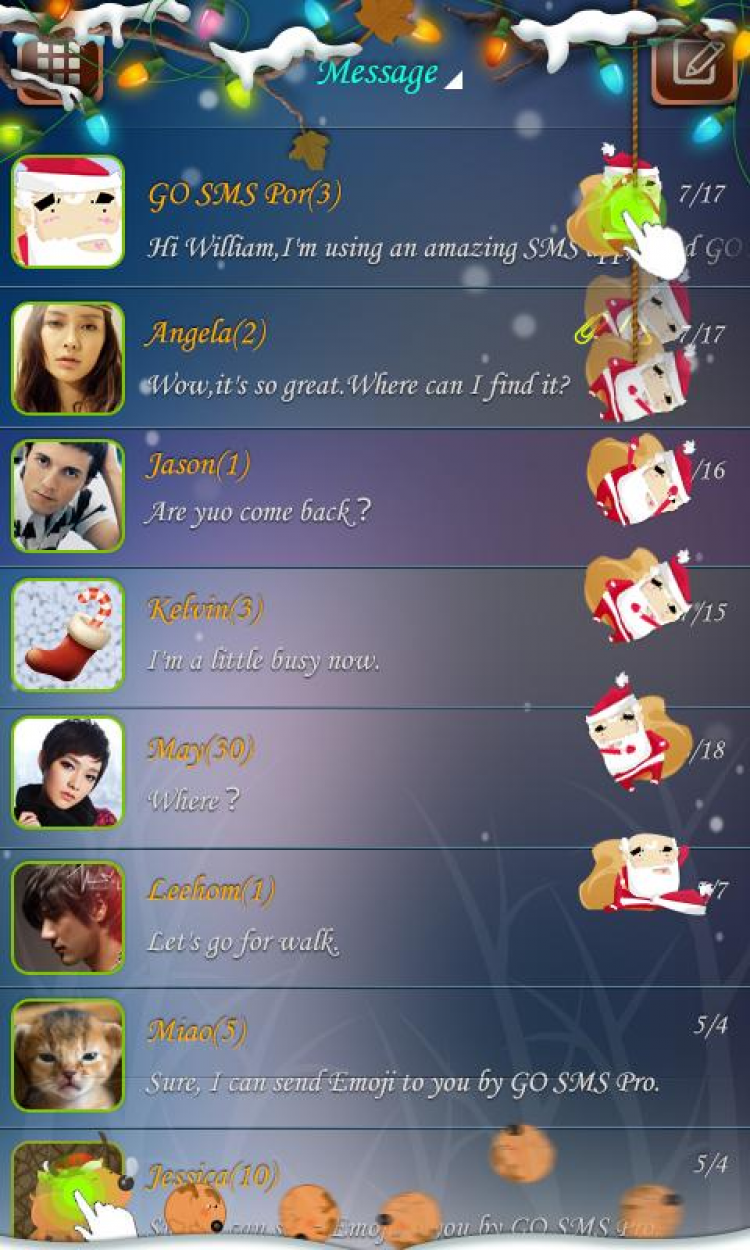GO SMS Pro Santa Super Theme Красивая рождественская тема оформления с изображением Санта Клауса для приложения GO SMS Pro. Установить тему: - Запустить GO SMS Pro; - Зайти в Application Center->Theme Store->Installed; - Найдите и выберите нужную вам тему. Приложение является платным и может быть куплено за специальную валюту Getjar Gold, но может быть предварительно установлено бесплатно.