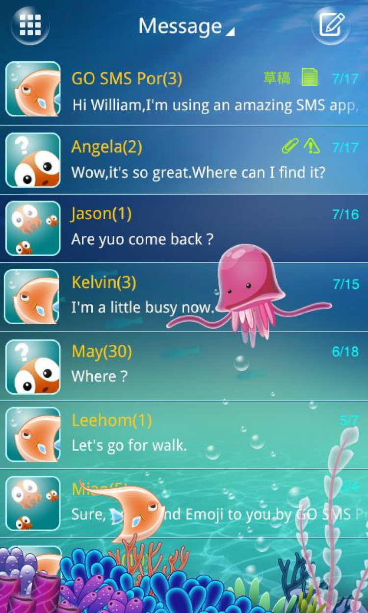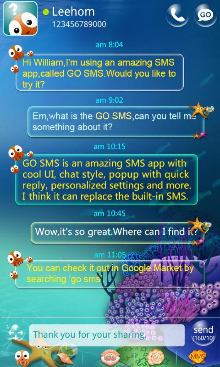 GO SMS Pro Seabed Super ThemEX Красивая подводная тема оформления для приложения GO SMS Pro. Обладает приятным оформлением и очень проста в установке.
