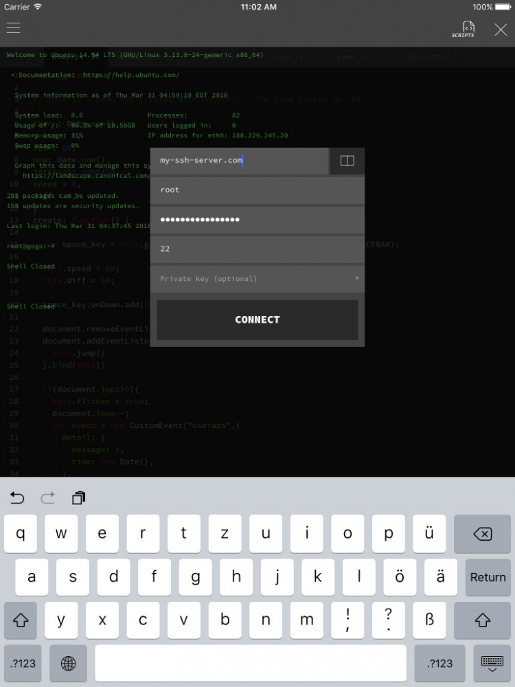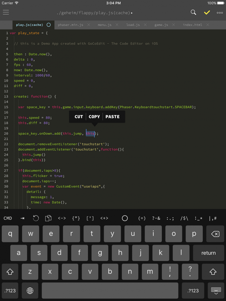 GoCoEdit - редактор исходного кода, поддерживающий несколько десятков различных языков, подсветку синтаксиса, и позволяющий работать с локальными или удаленными файлами. Он позволяет работать с проектами на всех мобильных iOS устройствах (iPhone, iPad и iPod Touch) где угодно и без ограничений.