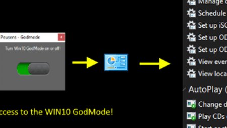 GodMode (Win10) это очень простая утилита, которая одним слайдером включает/выключает так называемый режим бога в ОС Windows 10. Интерфейс утилиты в буквальном смысле состоит из одного единственного слайдера, который добавляет на Рабочий стол новую папку с системными инструментами.В ней вы найдете более 200 различных инструментов, сгруппированных по назначению. Иными словами, режим бога, несмотря на громкое название, просто напросто предоставляет удобный доступ ко всем системным настройкам и инструментам из одной папки.