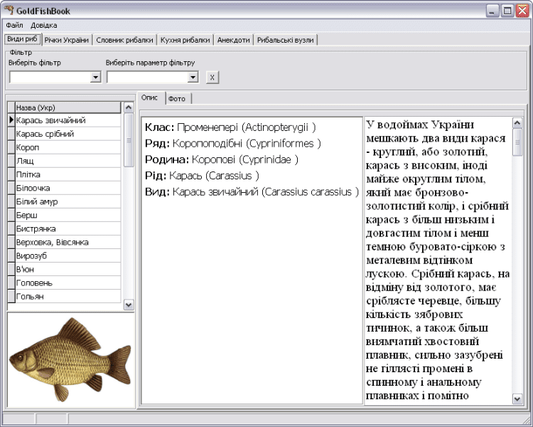 GoldFishBook - в это программе собрана информация, которая может стать полезной, как рыбакам новичкам так и профессионалам. В справочнике Вы найдете такую информацию: