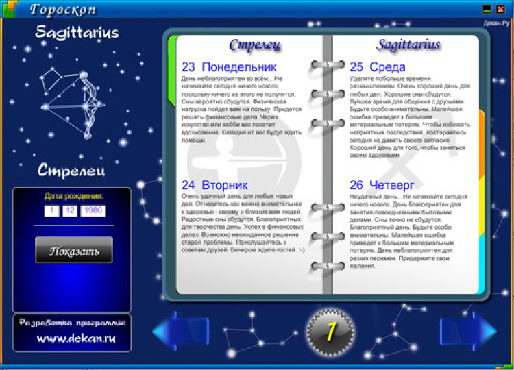Гороскоп - это программа предоставляет ежедневный прогноз на 2010 год для каждого знака зодиака. В наши дни практически каждый человек просматривает астрологические прогнозы, чтобы сверить свою жизнь с ритмами планет. Влияние планет на человека настолько велико, что люди пытаются как можно больше узнать о своём будущем. В результате появляется фантастическая возможность заглянуть в будущее и влиять на ход собственной судьбы. Сегодня и вы можете открыть для себя удивительный мир гороскопа, этот неизведанный и полный загадок мир...