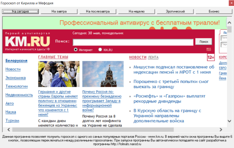 Гороскоп от Кирилла и Мефодия - это программа позволяет получить гороскоп с одного из самых популярных порталов России. Доступно 6 видов гороскопов: на текущий день, на завтра, на послезавтра, на текущую неделю, эротический, бизнес-гороскоп. При запуске программы Вы автоматически попадаете на сайт разработчика программы. Все проблемы, связанные с отображением гороскопа, не зависят от программы, ошибка на самом сервере.