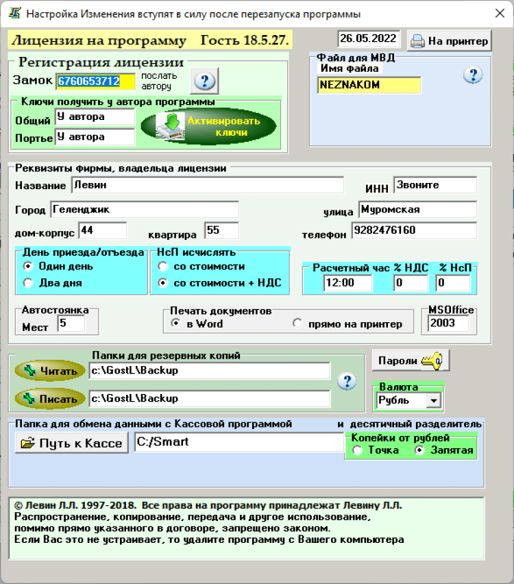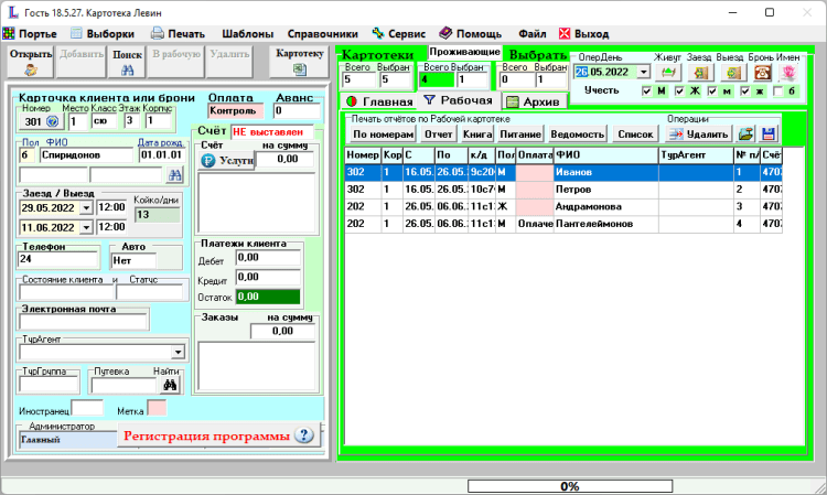 Гость Автоматизация работы администратора (портье) гостиницы, отеля, хостела, квартирной сети. Бронирование, поселение, переселение, выезд. Интерфейс связи с программой Smart Kassir для On-Line касс (54-ФЗ), применяемой в компьютерно - кассовых системах с фискальными регистраторами: Штрих-М, АТОЛ, Кристалл Сервис и др. Интерфейс к электронным замковым системам ORBITA и ADEL. Файл для автоматической регистрации граждан в МВД (ФМС) через программу ФМС.Контур. Как для граждан РФ так и иностранных граждан регистрация через интернет. Печать уведомления МВД (ФМС) о прибытии иностранного гражданина. Автоматическое заполнение и печать договора о посуточной аренде номера (квартиры), расписки и других гостиничных документов. По номерному фонду автоматически строятся шахматки номеров, мест, корпусов (домиков, бунгало) и план автостоянки. Расчет услуг – одной кнопкой. На шахматках Номера / Календарь (евро-технология) или Места / Календарь (хостел-технология), автоматически отображаются клиенты.