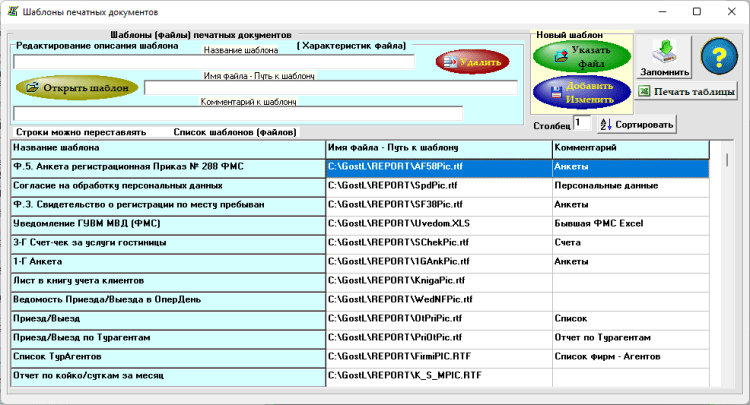 Печатаются анкеты Ф.5. для ФМС, 1-Г, 8-Г, 12-Г, счёт-чек, N 2-Г для ФМС, приходный и расходный ордера, счёт-фактура, акт выполненных работ, листы в книги учета клиентов и доходов ЧП, списки в столовую, графики загрузки номеров, списки должников, отчеты через Word и Excel (более 30 документов). Шаблоны перечисленных документов могут быть отредактированы пользователем.