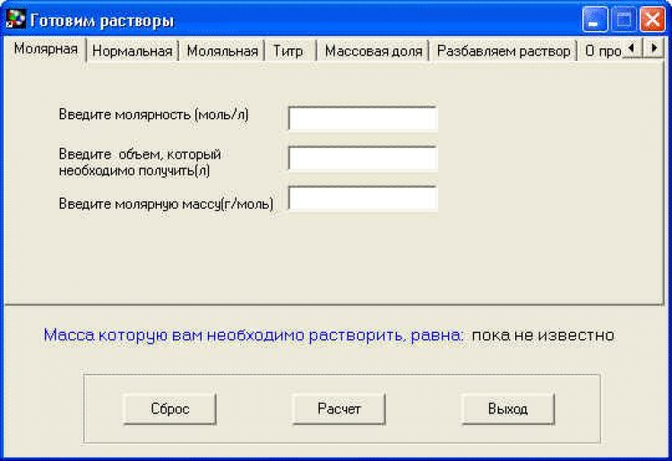 Готовим растворы - это программа для приготовления растворов с заданной концентрацией, причем концентрация может быть задана: молярностью,нормальностью, титром, массовой долей, а так же поможет разбавить раствор с заданной массовой долей.