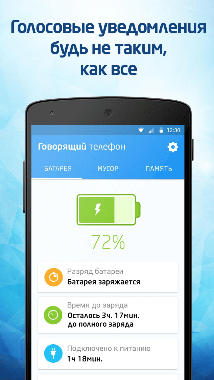 С приложением "Говорящий телефон 2" ваш Android-смартфон сможет человеческим голосом сказать вам текущее время, заряд батареи и другую полезную информацию. Данное приложение пригодиться пользователям с ограниченным зрением и все, что хочет меньше брать смартфон в руки. Оно работает на русском языке, и доступно бесплатно всем пользователями Android.