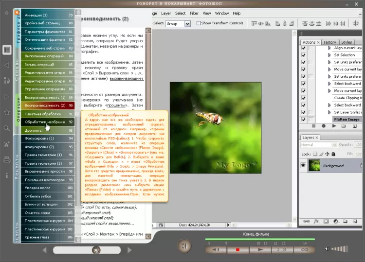 Каждый урок сопровождается в ней флэш-роликом, что позволяет любителям видео при просмотре иногда поглядывать в текст, а книголюбам сверяться при чтении с видео-иллюстрацией. Схватываете всё на лету и хотите выучить Фотошоп за три часа? Разверните ролики во весь экран и смотрите в режиме нон-стоп как один полнометражный фильм.