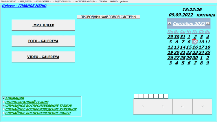 Проект Gplayer позволяет на весь экран просматривать фотографии и на фоне играть песни. Фотографии можно настроить на время показа и в случайном порядке. Очень много настроек воспроизведения музыки, которые легко меняются. Проект, так же, позволяет показывать видео файлы...