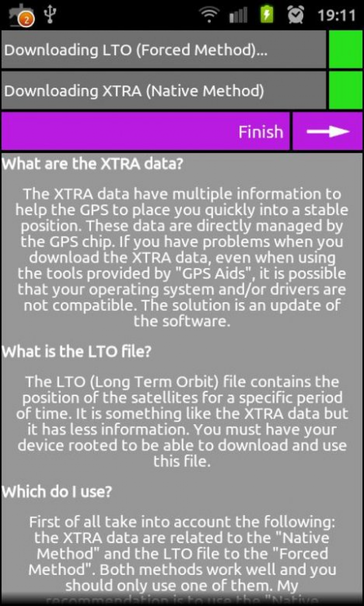 Программа, способная решить распространенную проблему с долгим поиском GPS-спутников на Android-устройствах. При этом, вам не придётся делать ничего самостоятельно: GPS Aids всё сделает за вас. Вас необходимо всего лишь запустить программу и нажать на соответствующую кнопку - Download GPS Aids. Если же этот способ не сработал, вы можете воспользоваться более эффективным режимом, рассчитанным на продвинутых пользователей - Force LTO data download. Для использования последнего необходим ROOT.