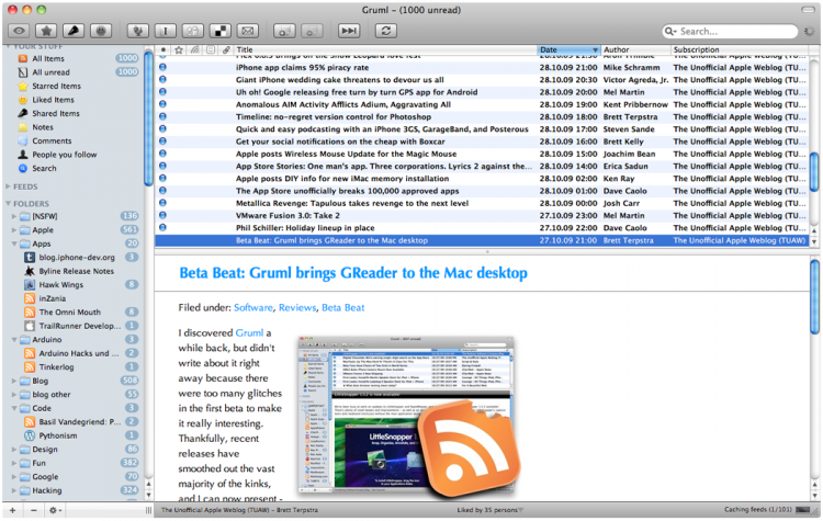 С помощью Gruml можно просматривать новости, сортировать их по категориям, добавлять тэги и многое другое. Все изменения будут автоматически синхронизированы с аккаутов Google Reader.