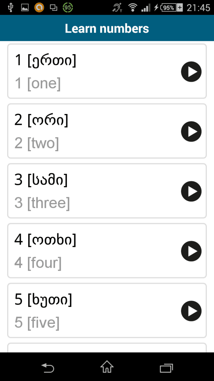 Грузинский 50 языков В этой программе содержится 100 уроков, дающих возможность начинающим выучить базовую лексику. Даже не имея достаточных знаний на данный момент, Вы очень быстро научитесь свободно говорить короткими предложениями в реальных жизненных ситуациях. Чтобы получить наибольшую пользу от 50языков, учите по одному уроку в день и регулярно повторяйте пройденное за предыдущие уроки.