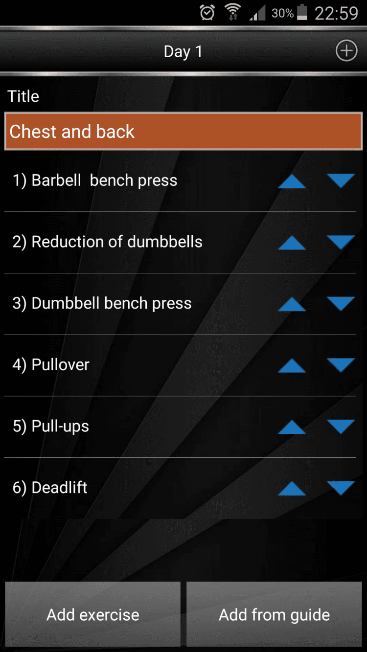 - создание тренировочной программы с произвольным количеством тренировочных дней;