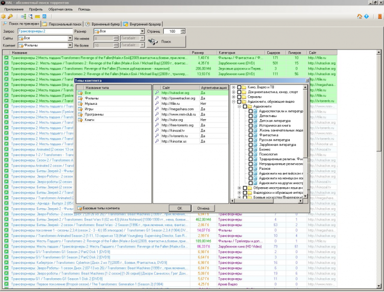Программа HAL производит поиск торрент-файлов на всех выбранных пользователем торрент-трекерах одновременно. Если пользователь зарегистрирован на нескольких трекерах, то в программе HAL ему достаточно всего один раз ввести свой логин и пароль к трекеру и после этого поиск по данному трекеру будет доступен в любое время.