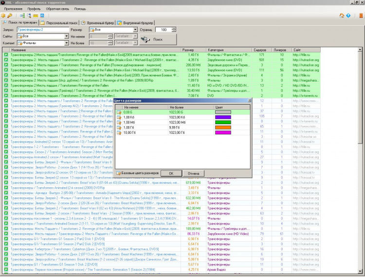 - Поиск по группе сайтов. Все сайты собираются в различные группы. Пользователь может добавлять сайты в существующие группы или создавать также собственные группы сайтов. На каждом из сайтов, находящихся в группе, программа авторизируется если это необходимо и далее произведет поиск торрентов. Этот варинт поиска также предполагает выбор типа контента (например, кино или музыка) который необходимо найти. По завершении процесса у пользователя есть удобная возможность отфильтровать результаты по размеру.