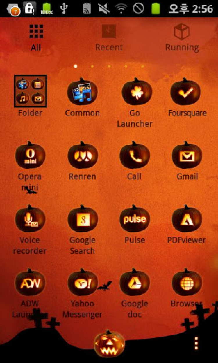 Halloween Pumpkin GO Locker Красивая тема оформления для приложениz или Go Locker, выполненная в хэллоуинском стиле, украшенная тыквами. Для применения темы, необходимо открыть основное приложение, затем зайти в MENU->Themes->Locker->а затем выбрать интересующую вас тему.