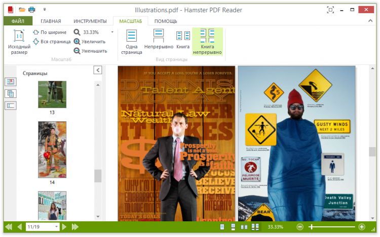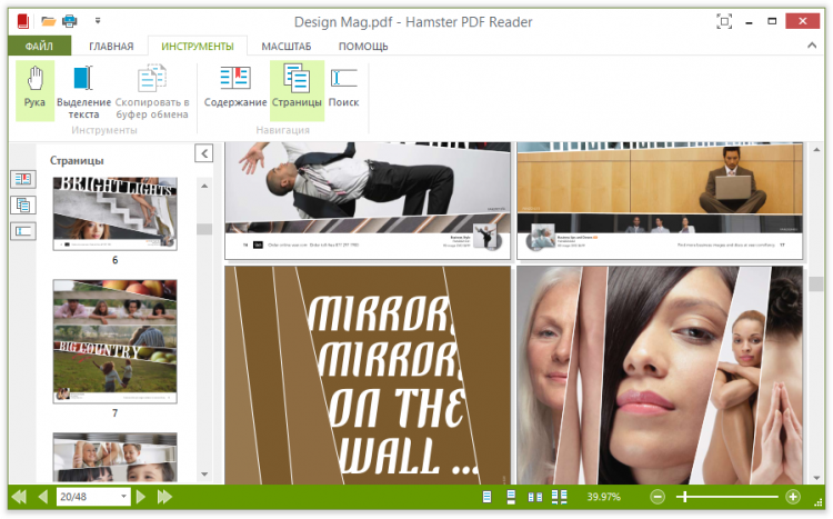 - Интуитивный интерфейс. Минималистический интерфейс идентичен оформлению программ от Microsoft, поэтому Hamster PDF Reader воспринимается как стандартное предложение Windows. Все функции расположены вверху экрана и разделены на простые категории. Благодаря функции масштабирования, пользователь может просматривать несколько страниц одновременно. Интерфейс доступен на английском и руссом языках.