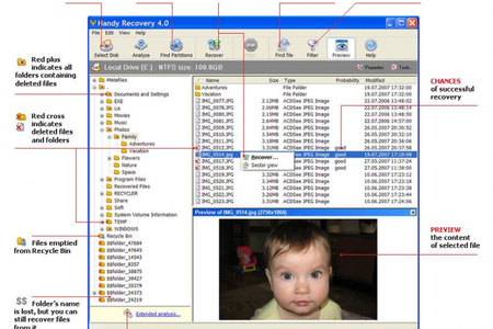 Handy Recovery - это программа для восстановления файлов случайно удаленных в MS Windows, а также поддерживающая работу с CF, SD и другими картами памяти. Окно предварительного просмотра позволяет увидеть содержимое файла перед восстановлением. Утилита способна извлекать данные с поврежденных или удаленных партиций, а также создавать образ диска для отложенного восстановления. Файлы удаленные из Корзины отображаются в специальной папке. Функция поиска расширена возможностью задавать критерии фильтрации. Поддерживаются файловые системы NTFS, FAT и HFS.