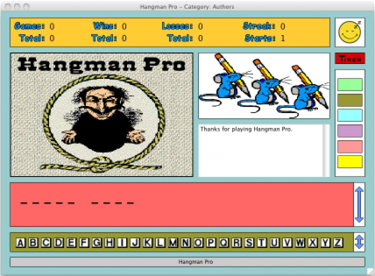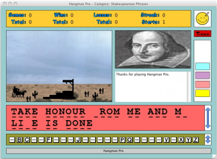 Hangman Pro Классическая игра "виселица" для вашего Mac. Угадывайте популярные цитаты из всем известных произведений, играя при этом в знакомую с детства игру. Игра обладает приятной графикой, но не перегружена лишними эффектами. Скачайте Hangman Pro бесплатно на goida-soft.ru