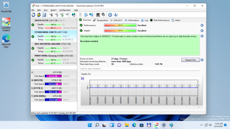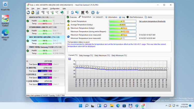 Hard Disk Sentinel непрерывно следить за состоянием жестких дисков, его температурой, S.M.A.R.T. данными и другими параметрами. В случае возникновения проблем или повышения температуры программа сразу сообщит об этом пользователю или же выключит компьютер во избежание ухудшения состояния диска.
