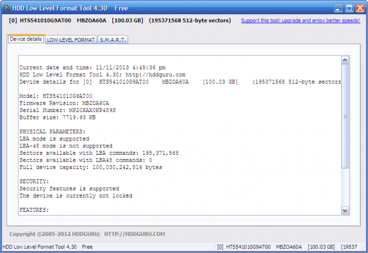 HDD Low Level Format Tool имеет простой интерфейс, который предоставляет подробную информацию о выбранном устройстве: номер модели, версию прошивки, серийный номер, размер буфера, физические параметры и многое другое.