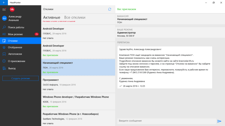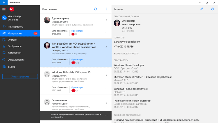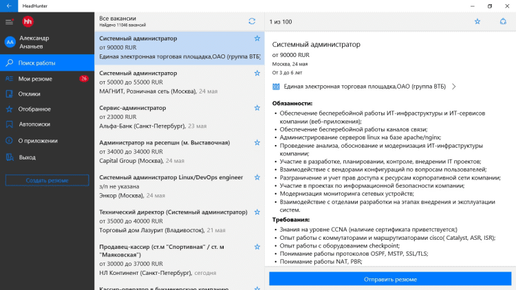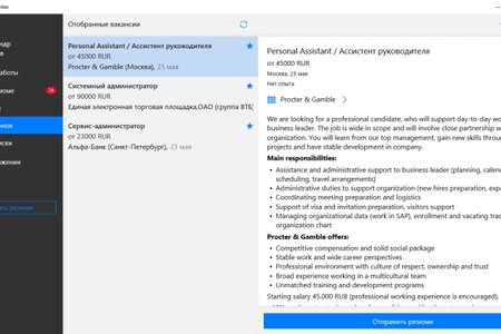 Программа, которая поможет вам найти работу в разных городах России, Украины, Казахстана и Белоруссии. Просматривайте огромное количество вакансий и приглашений на собеседования, сохраняйте вакансии в личном кабинете или создавайте собственное резюме. Вы будете получать уведомления об откликах на ваше резюме, а так же сможете откликаться на предложенные вам варианты работы прямо через приложение.