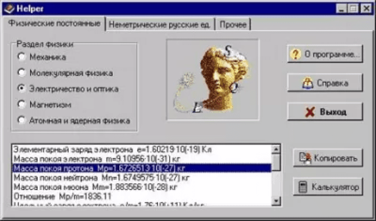 Helper - это программа-помощник для физиков, инженеров и других, кому, в силу своей деятельности, приходится заниматься расчётами на компьютере; содержит приличное количество физических констант и других тонкостей. Выберите раздел физики - ...и просматривайте доступные константы.