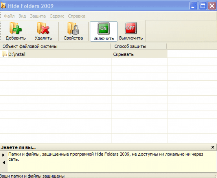 Hide Folders 2009 — это удобная и простая в использовании программа для защиты вашей конфиденциальной информации от посторонних. Программа позволяет скрывать и блокировать доступ к целым папкам и отдельным файлам, а так же защитить ваши данные от модификации.