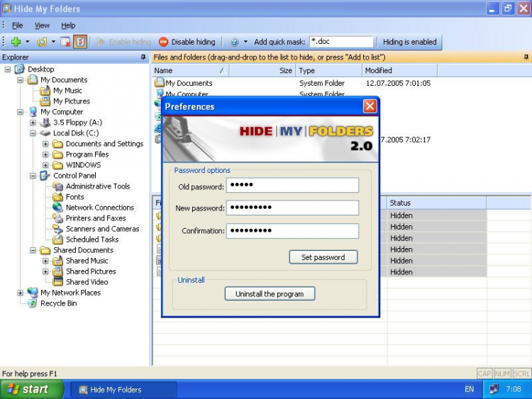Hide My Folders - это полезная программа, которая поможет скрыть от посторонних глаз и предотвратить несанкционированный доступ к важным файлам и папкам. Она исключая скрытые файлы и папки из поиска, так что никто, кроме их владельца, не сможет их найти.