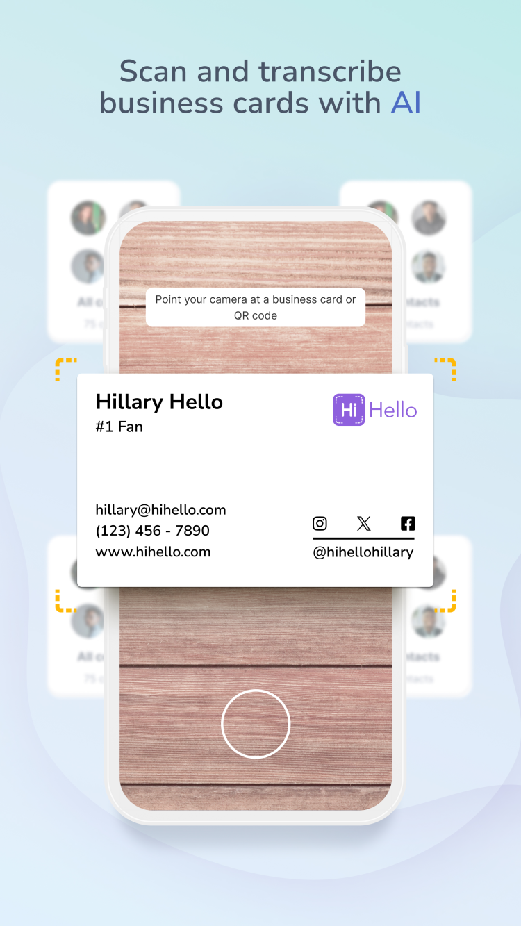 HiHello — это мобильное приложение, разработанное для легкого создания и распространения цифровых визитных карточек, с использованием только вашего смартфона или планшета. Для этого не требуются навыки дизайна или долгое монотонное редактирование: просто укажите некоторую информацию о себе и своем бизнесе и наслаждайтесь результатом за считанные секунды.