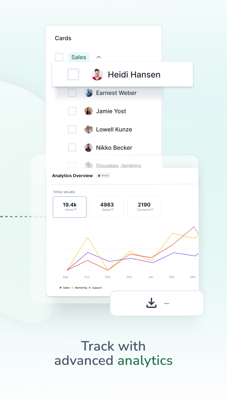 - отправка визитных карточек с помощью QR-кода, NFC, электронной почты, ссылки или текстового сообщения