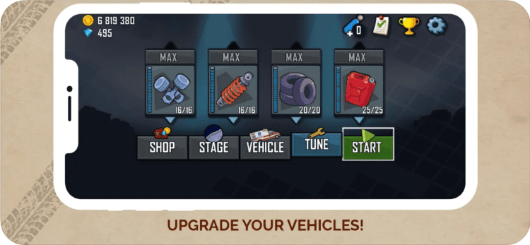 Приятной особенностью игры Hill Climb Racing является возможность улучшения машин. Обновляйте запчасти своих машин, покупая новые двигатели, шины, улучшая полный привод (4WD) и подвеску, чтобы лучше справляться с препятствиями на трассе.