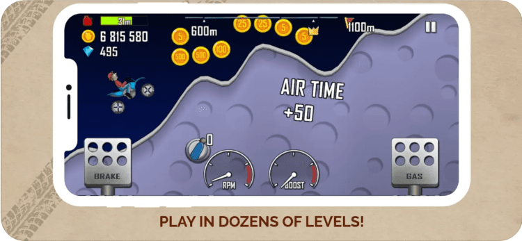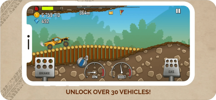 В игре Hill Climb Racing, вам предстоит проехать по самым разным локациям. Прокатитесь по сельской местности, пустыне, американским горкам и даже другим планетам, где гравитация заметно отличается от земной и управлять машиной несколько сложнее.