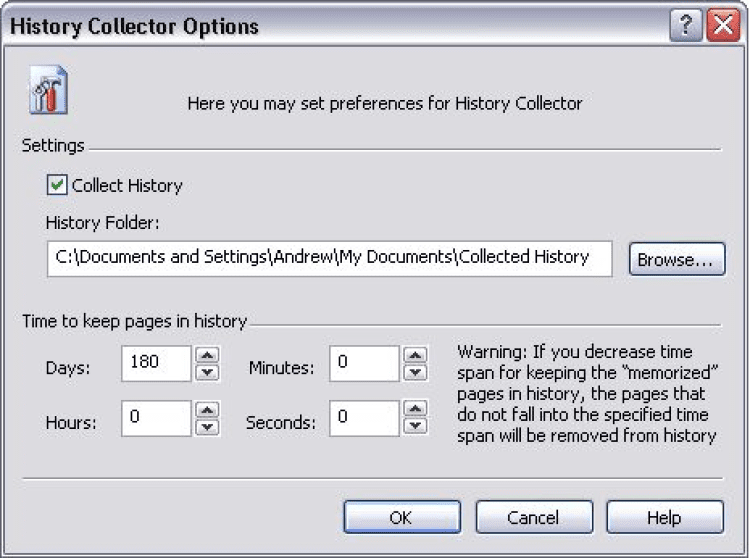 History Collector - это программа, которая сохраняет веб странички локально на Вашем компьютере, поэтому Вы всегда можете просмотреть веб странички посещенные несколько дней назад, даже в режиме оффлайн. Странички сохраняются в стандартном (*.mht, *.htm) формате, поэтому их можно открывать в любом веб-браузере.