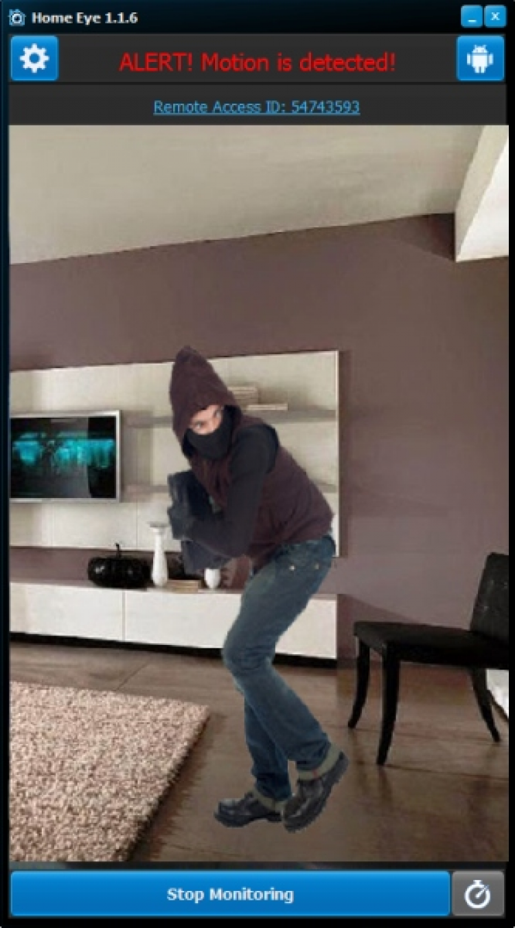Home Eye использует веб камеру, подключенную к ПК, или камеру мобильного устройства для слежения и детектирования движений. Запустите Home Eye, включите мониторинг и оставьте устройство дома. В случае обнаружения подозрительного движения, приложение включит сирену, сделает снимки с помощью камеры, и отправит вам уведомление. Узнав о происходящем, вы сможете немедленно принять меры, например, вызвать полицию или охрану. Наверняка у вас есть мобильный телефон, который всегда с вами. Этот телефон вы можете использовать в качестве Монитора, для дистанционного просмотра видеопотока с домашнего устройства. На экране будет отображаться все, что снимает в данный момент камера. И это очень удобно, ведь вы будете в курсе происходящего, где бы не находились. Также имеется возможность удаленного включения и отключения мониторинга, изменения настроек приложения.