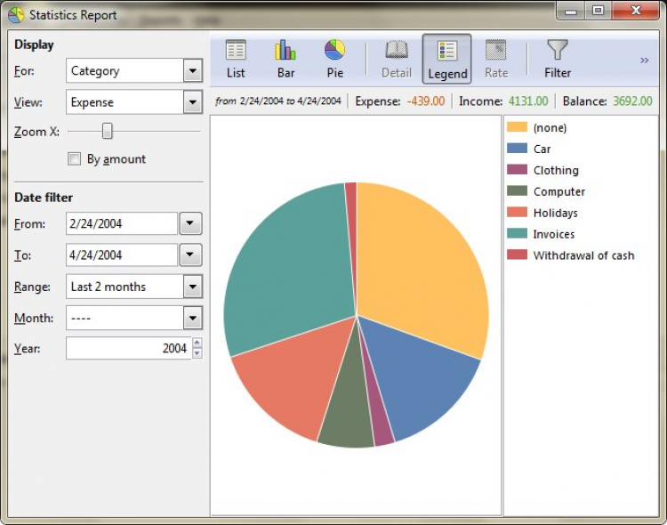 HomeBank предоставляет инструментарий для анализа финансового состояния и составления отчетов. Программа может генерировать динамические отчеты, которые отражают текущее состояние семейного бюджета. Есть возможность фильтрации транзакций и гибкой настройки параметров отчета. Программа HomeBank может строить диаграммы на основе данных. Диаграммы могут быть линейными, круговыми или столбцовыми.