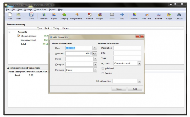 В HomeBank удобно работать и управлять транзакциями. Программа позволяет упорядочивать их, деля на категории, планировать транзакции для автоматического вноса в базу данных (например, ежедневные счета), добавлять тэги и многое другое. В программе так же есть функция одновременного редактирования нескольких полей, что может существенно ускорить и упростить процесс.