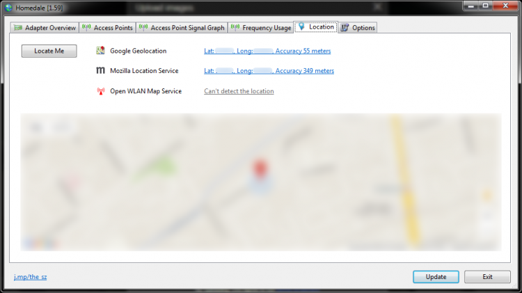 Homedale также строить график использования частот, которые позволяет легко узнать, какие частоты использую обнаруженные WiFi точки. Как и в предыдущем случае график можно сохранить как изображение. Еще одна функция программы, о которой стоит сказать - возможность определения географических координат WiFi точки, к которой подключен ваш компьютер. Для этого программа использует сервисы Google Geolocation, Mozilla Location Service и Open WLAN Map Service.