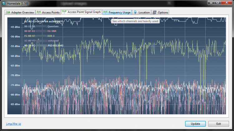 Кроме общей информации о точке доступа, Homedale позволяет мониторить силу WiFi сигнала. Программа строит наглядный график, который отображает изменение силы сигнала в течении времени, позволяя оценить его стабильность. Таким образом можно мониторить сразу несколько WiFi точек. Программа может сохранить график в виде изображения или создать лог файл (обычный текстовый файл).