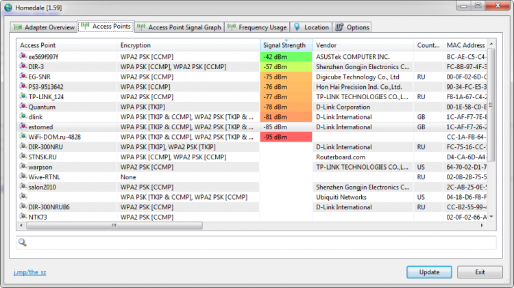 Используя возможности, предлагаемые программой Homedale вы сможете узнать массу информации о беспроводных точках доступа, сигнал которых доходит до вашего ноутбука (или компьютера с WiFi адаптером). Кроме названия WiFi точки, программа покажет ее производителя, MAC адрес, тип шифрования данных, частоту, силу сигнала, режим работы и многое другое. Вся информация отображается в таблице. Информацию можно сортировать по колонкам, а ненужные колонки убрать.
